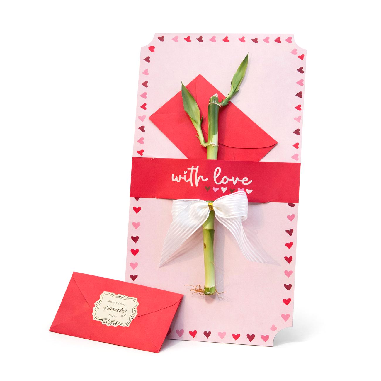 Além de entregar uma planta que tem muito simbolismo e significado com o Bambu da Sorte, você também pode enviar sua mensagem em um envelope vermelho, cheio de amor! Esse é o nosso cartão 'with love' que pode ser usado como complemento ou item único para presentear qualquer pessoa.