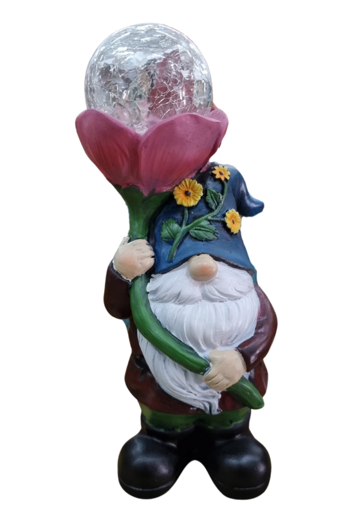 Perfeito para decorar ambientes internos e externos, o nosso carismático Duende de Jardim segura uma flor com uma esfera de luz na parte superior que é alimentada por energia solar.