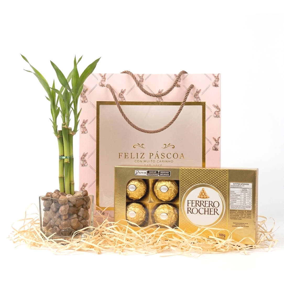 Composto por um vaso com Bambu da Sorte com 3 Hastes, além de uma inconfudível e deliciosa caixa com 8 chocolates Ferrero Rocher.